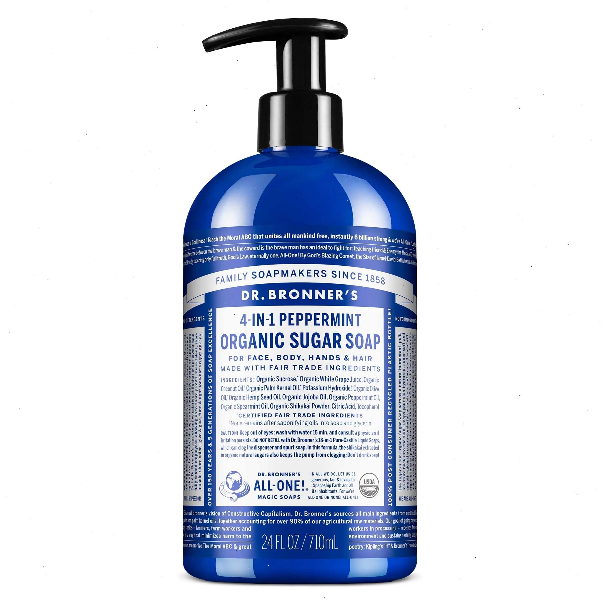 4-in-1 Organic Pump Soaps are good for washing hands, body & hair & place by your sink or in the shower! To wash hair work one pump of Organic Pump Soap into wet hair until it lathers, then rub and rinse. Repeat for thicker or longer hair. After washing, follow up with a lightly acidic conditioning rinse, like Dr. Bronner's Citrus Organic Hair Rinse to leave hair silky smooth! Don't have our Organic Hair Rinse? Use diluted apple cider vinegar or lemon juice! OK! Do not use this scent with children under three years old, as the tingle from the peppermint can be overwhelming for them.