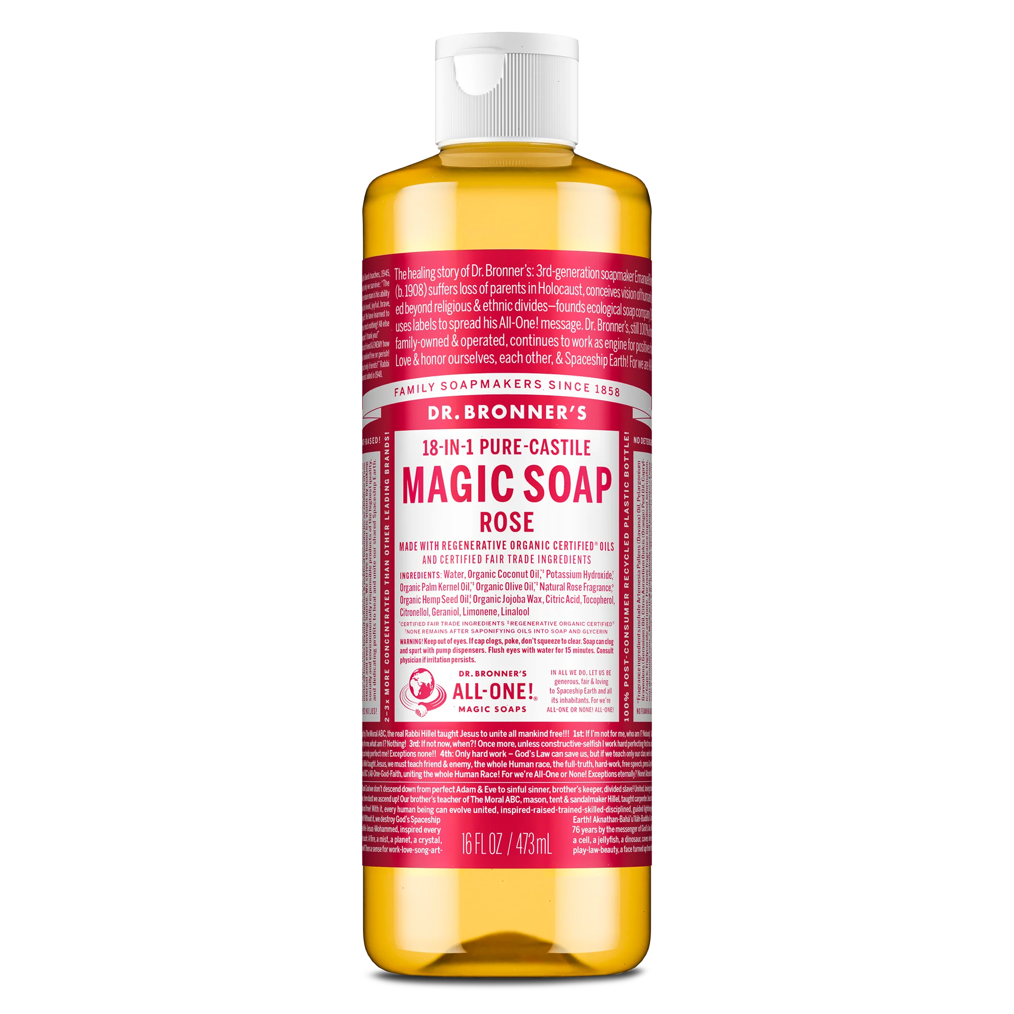 Indulge in the scent of fresh roses with Dr. Bronner’s Rose Liquid Soap. This true soap is infused with a high concentration of naturally derived rose fragrance, leaving skin feeling soft and refreshed. Made with Regenerative Organic Certified® oils, it creates a rich, luxurious lather that cleans while rinsing clean. Crafted with organic, ethically sourced ingredients—no detergents, dyes, or added foaming agents. Vegan, made with organic oils, fair trade, and EWG Verified®—shower with trust!